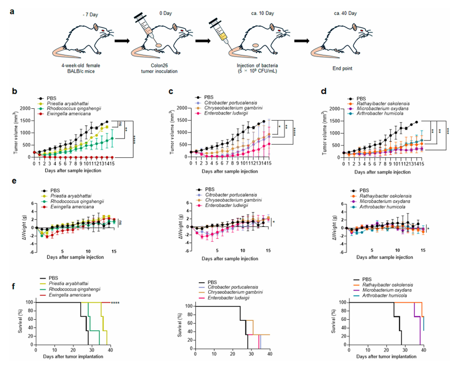 不同菌株展现出了截然不同的抗癌活性。其中,部分细菌(如来自树蛙的P. aryabhattai)并未显示出抗肿瘤效果;另有部分细菌在初期抑制了肿瘤生长,但随后肿瘤出现了复发。振奋的发现来自于日本树蛙肠道分离出的一株兼性厌氧菌——美洲尤文氏菌(Ewingella americana)。单次注射该菌后,小鼠体内的肿瘤被完全清除,实现了100%的完全缓解(CR),且显著延长了小鼠的整体生存期。