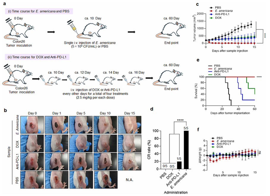 为了客观评估E. americana的临床应用潜力,研究团队将其与现有的标准化疗法进行了平行对比,包括免疫检查点抑制剂(抗PD-L1抗体)和化疗药物(脂质体阿霉素,DOX)。常规疗法组的小鼠接受了每隔一天一次、共计四次的静脉注射治疗。