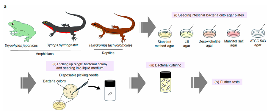 研究团队选取了进化路径独特的低等脊椎动物作为样本来源,包括两种两栖动物:日本树蛙(Dryophytes japonicus)和红腹蝾螈(Cynops pyrrhogaster),以及一种爬行动物:日本草蜥(Takydromus tachydromoides)。通过严格的无菌采样与多种培养基筛选,团队成功从这些动物的肠道中分离出45株不同的细菌个体。